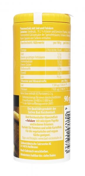 Bad Reichenhaller Alpenjodsalz + Folsäure mit würzigem Paprika und leckeren Kräutern: Eine schmackhafte Rezeptur, kreiert, um den begehrten frittierten Kartoffelstäbchen den letzten Schliff zu geben. Natürlich verleiht das Pommessalz nicht nur Pommes, sondern auch wilden Kartoffeln die richtige Würze. Einfach zum Anbeißen!