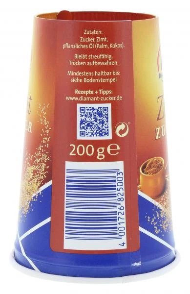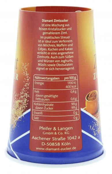 Diamant Zimt-Zucker ist eine Mischung aus feinem Kristallzucker und gemahlenem Zimt. Im praktischen Streuer ist er ideal zum Verfeinern von Milchreis, Waffeln und Crépes. Kuchen und Kakao verleiht er eine angenehme Zimtnote. Auch zum Süßen und Würzen von Joghurts, Müslis sowie Obstsalaten eigent sich hervorragend.