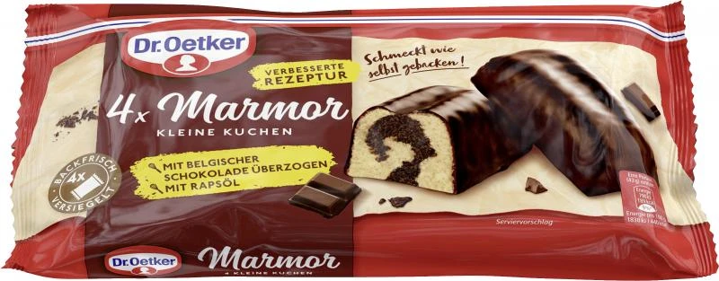Die vier fertigen Marmor-Gebäcke bestehen aus einer Kombination von saftiger Kakaorührmasse und Rührmasse mit Vanillegeschmack, mit einer feinen Schokoglasur für besondere Geschmacksintensität – für köstliche, spontane Genussmomente im Alltag.Einzeln verpackt eignen sich die Ein-Portionen Küchlein als Kuchengenuss zum Mitnehmen. Sie sind stets genussbereit und ideal für unterwegs und zwischendurch, egal, ob als Snack bei der Arbeit, für zu Hause oder als Mitbringsel zu Kaffee und Kuchen.Die marmorierten Küchlein mit locker saftiger Konsistenz schmecken wie selbstgebacken und sehen dank der typischen Rührkuchen Form auch so aus. Die köstliche Glasur aus dunkler Schokolade verleiht ihnen den letzten Schliff.Die vier kleinen Marmor-Rührkuchen (4 x 43g) als Klassiker im Mini-Format sind angelehnt an die Rezeptur der beliebten großen Fertigkuchen von Dr. Oetker. Sie sind sowohl geschmacklich als auch optisch ein echtes Highlight für den spontanen Genuss zwischendurch.