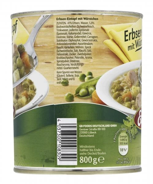 Besonders lecker durch die sorgfältige Auswahl bester Zutaten schmeckt der Erasco Erbsen-Eintopf. Schonend zubereitet aus aromatischen Erbsen, vielen Möhren- und Kartoffelstückchen sowie saftigem Schweinefleisch. Schmeckt immer wieder einfach lecker und unglaublich gut. Guten Appetit!