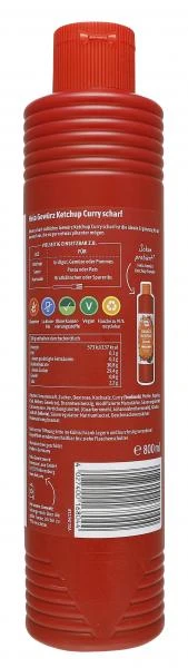 Der scharf-süßliche Gewürz Ketchup Curry scharf ist die ideale Ergänzung für alle Fans, die es gern etwas pikanter mögen. Als Ketchup für Grillgut, Gemüse oder Pommes, als Sauce für Pasta oder Reis und als Marinade für Brathähnchen oder Spareribs.