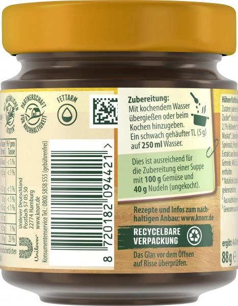 Knorr Hühner Kraftbouillon ist eine aromatische Bouillon mit kräftigem Huhngeschmack. Ideal als Suppendrink oder zum Würzen und Verfeinern von Gerichten. Knorr Brühen und Bouillons bilden die Geschmacksgrundlage für zahlreiche Rezeptideen. Im praktischen Glas immer vorrätig und frei dosierbar.Ohne Farbstoffe.