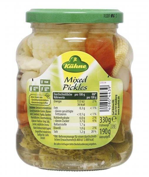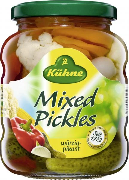 Mixed Pickles schmecken hervorragend als Beilage zur Brotzeit, raffinierten Dips oder direkt aus dem Glas als Snack für Zwischendurch. Besondere Würze bringen sie in traditionelle Rezepte wie Kartoffelsalat. Fein abgeschmeckt mit körnigem Senf – ein absoluter Genuss!