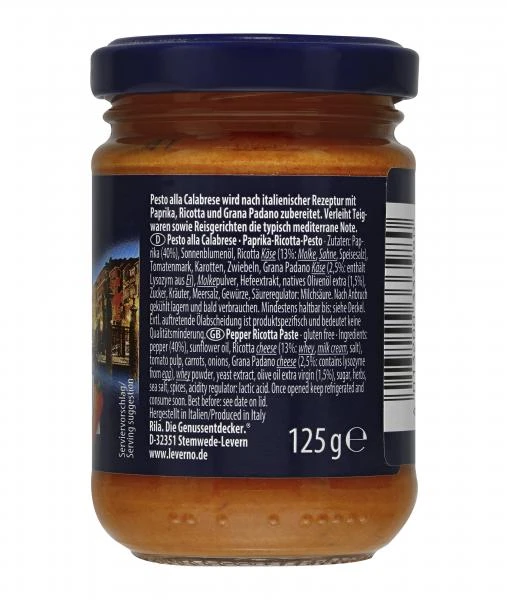 Pesto Calabrese wird nach italienischer Rezeptur mit Paprika, Ricotta und Grana Padano zubereitet. Verleiht Teigwaren sowie Reisgerichten die typisch mediterrane Note.