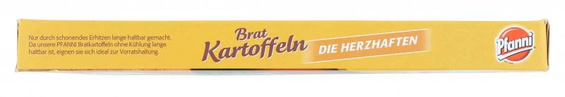 Bratkartoffeln aus blanchierten Kartoffeln. Für 100g Pfanni Bratkartoffeln werden 148g frische, zu 100% in Deutschland geerntete Kartoffel verarbeitet. 2 Portionen für die Pfanne.
