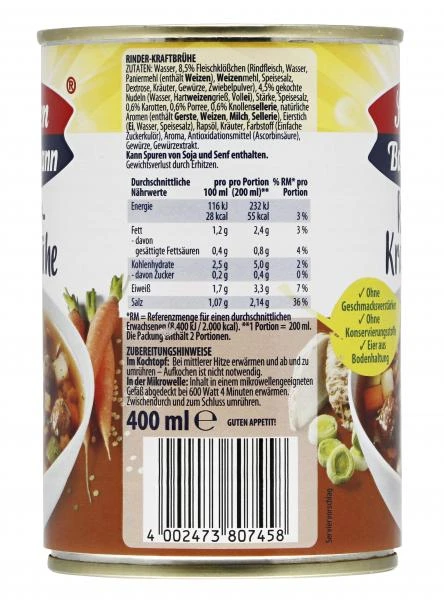 Artikelnummer: 4502050439 Kategorien: Dosengerichte, Fertiggerichte & Konserven, Suppen, Weitere Suppen Schlagwort: Sonnen Bassermann