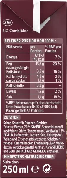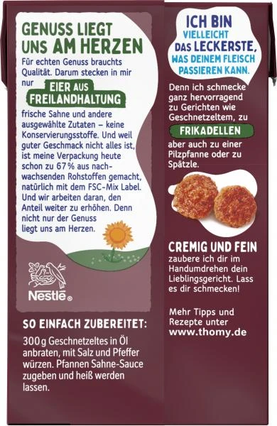 THOMY Les Sauces Pfannen Sahne-Sauce ist eine cremige Sahne-Sauce für Fleisch aller Art. Sie unterstützt raffiniert die köstlichen Röstaromen, die beim Anbraten in der Pfanne entstehen. Reines Sonnenblumenöl, Schlagsahne und Eigelb von Eiern aus Bodenhaltung geben der THOMY Les Sauces Pfannen Sahne-Sauce ihren unwiderstehlich sahnigen Geschmack, der mit feinen Gewürzen und einem Schuss Weinbrand und einem Extrakt aus Weißwein delikat abgeschmeckt wird.