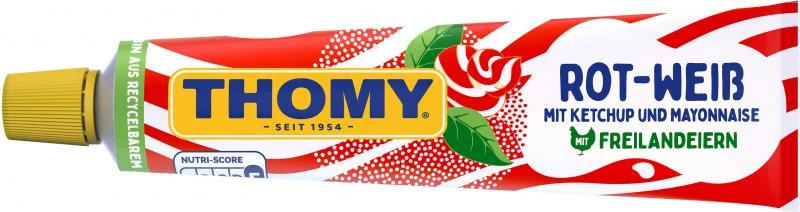 Mit Thomy Rot-Weiß machen Sie Ihre Pommes zu einem echten Klassiker. Die gestreifte Optik aus Ketchup und Mayonnaise ist ein besonderer Hingucker auf dem Teller oder auf Finger-Food. Dekorieren sie z.B. Grillfleisch damit. Thomy Rot-Weiß schmeckt ideal auch als Sandwich-Creme oder zu Frikadellen und Hamburgern.