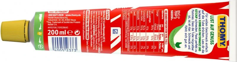 Thomy Rot-Weiß Ketschup & Mayonnaise mit seinen sich abwechselnden Mayonnaise- und Ketchupstreifen passt ideal zu Pommes, Sandwiches, Frikadellen und Hamburgern. Abgefüllt in eine praktische Tube. Selbstverständlich ohne Farb- und Konservierungsstoffe.